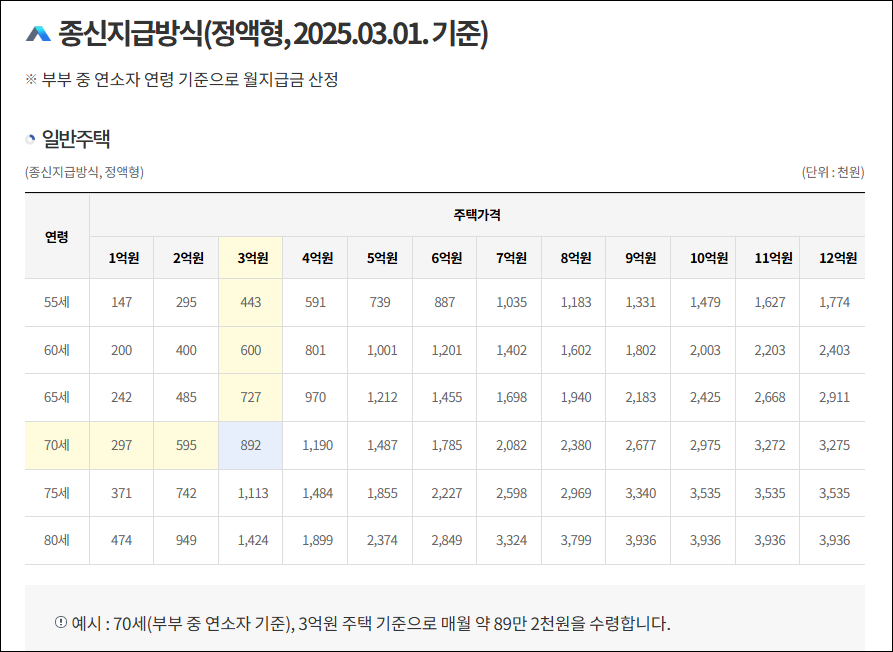 2025년 3월 1일 기준 종신 지급 방식(정액형)으로 계산할 때, 예를 들어 부부 중 연소자가 70세이고 주택의 시세가 5억 원이라면, 월 수령액은 약 90만 원 내외가 될 수 있습니다.